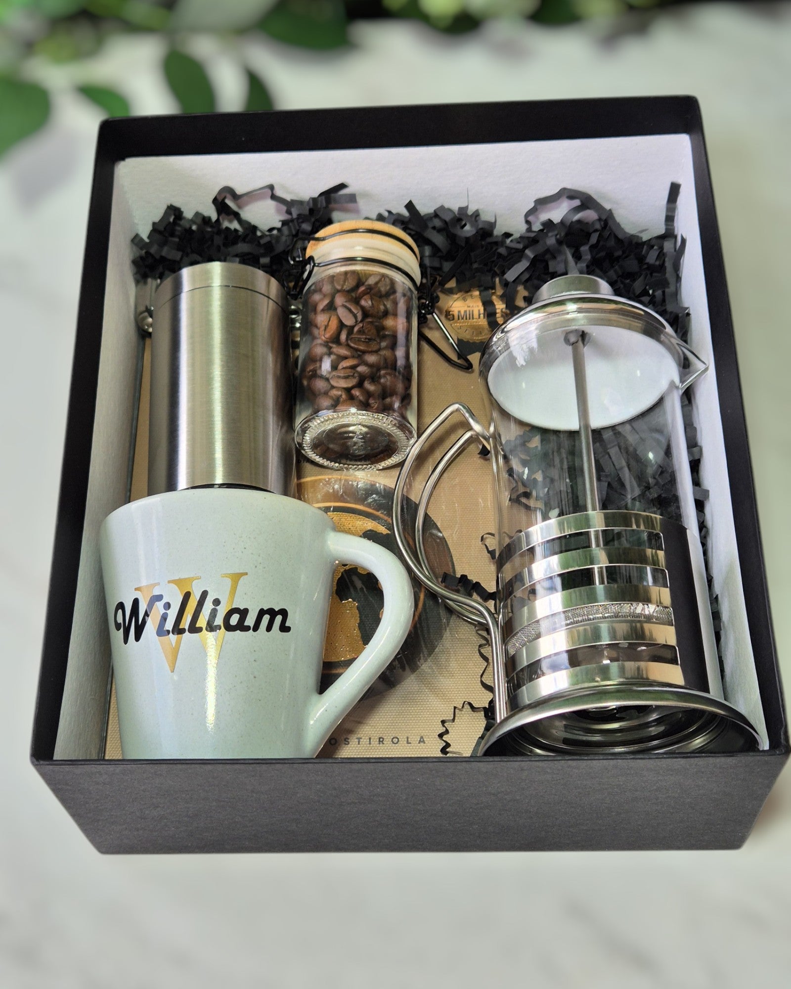Nessa linda proposta, temos uma caixa Cartonada 22x25 (Checar disponibilidade de cores), 1 Livro campeão de vendas Café com Deus Pai, 1 Pote de vidro com café em grãos, 1 Caneca de cerâmica de 300 ml, 1 Prensa Francesa de Copo 600ml, um lindo Moedor de Café com manivela.