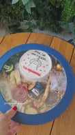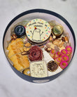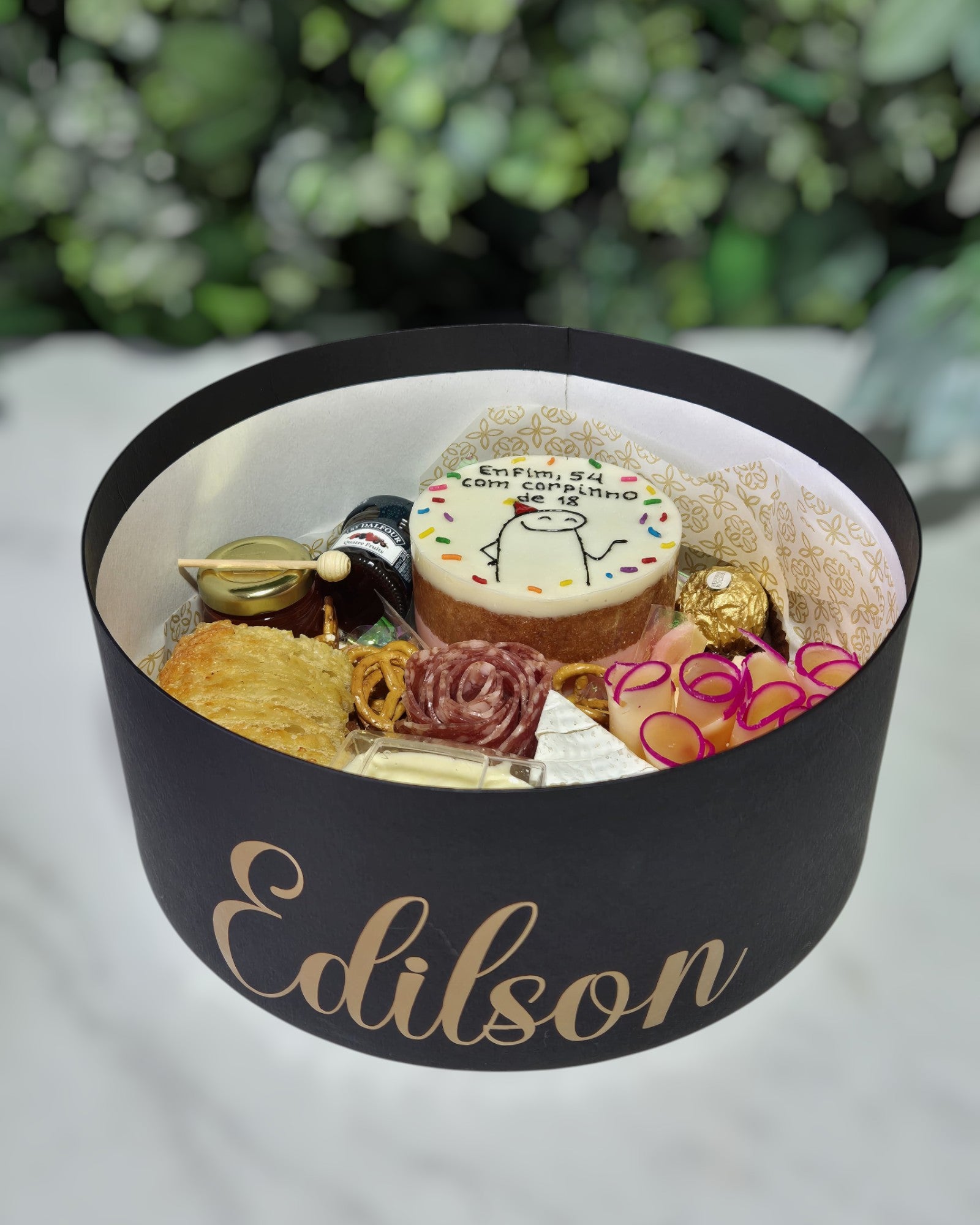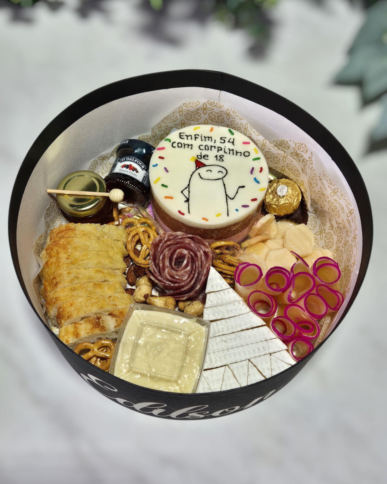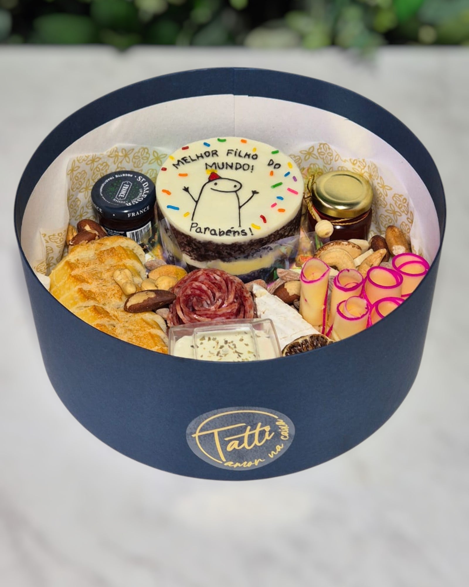 Bolo Bentô 10cm com frase personalizada (sabores da massa e do recheio a escolher), Queijos: brie, gouda e parmesão. Salame, pão ciabata, pastinha salgada, mel, geleia e bombom importado e Cartão De/Pará.
