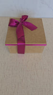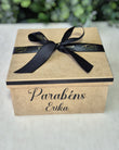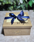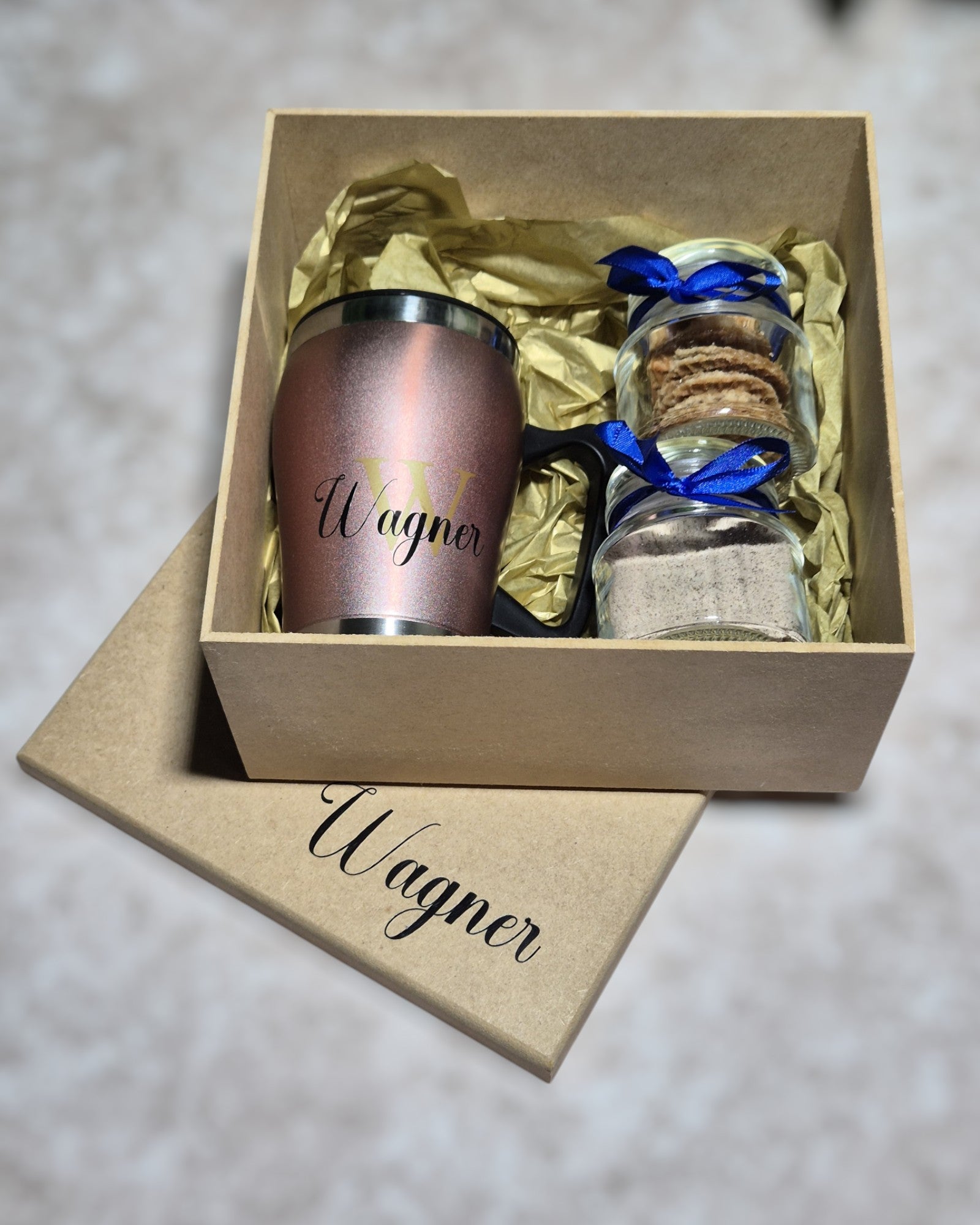 Decoração na caixa com fitas em cetim, papel de seda e caneca térmica personalizada com a inicial da letra do nome .