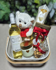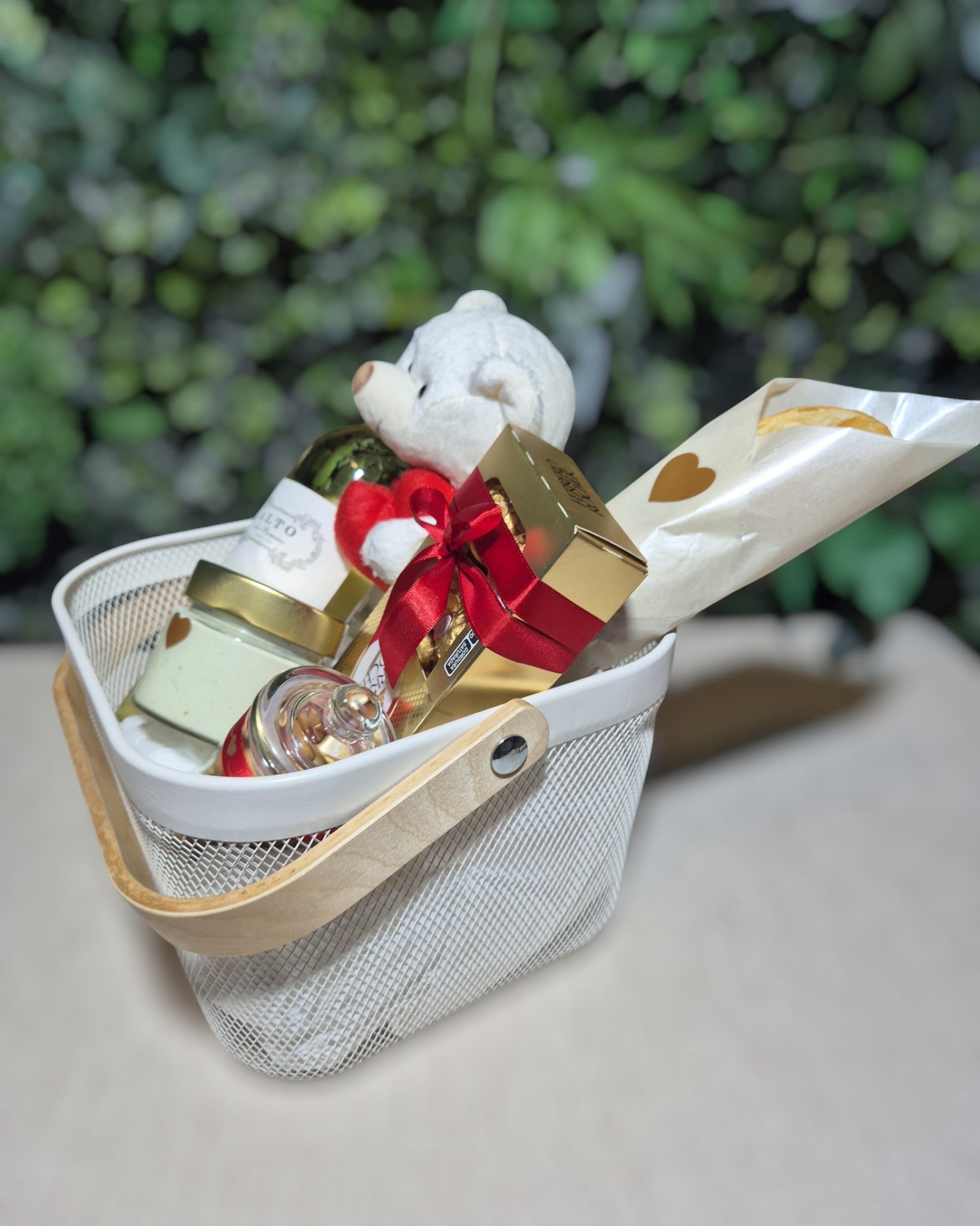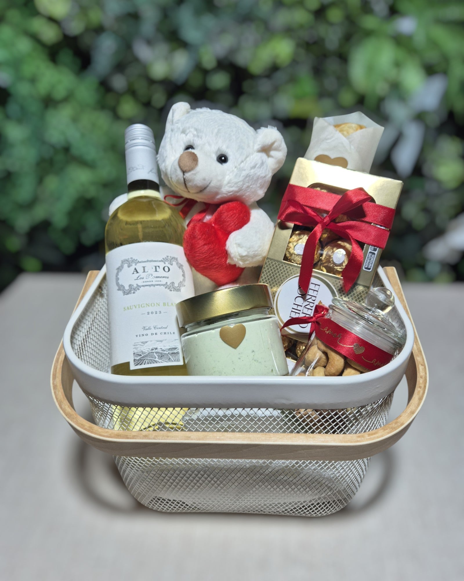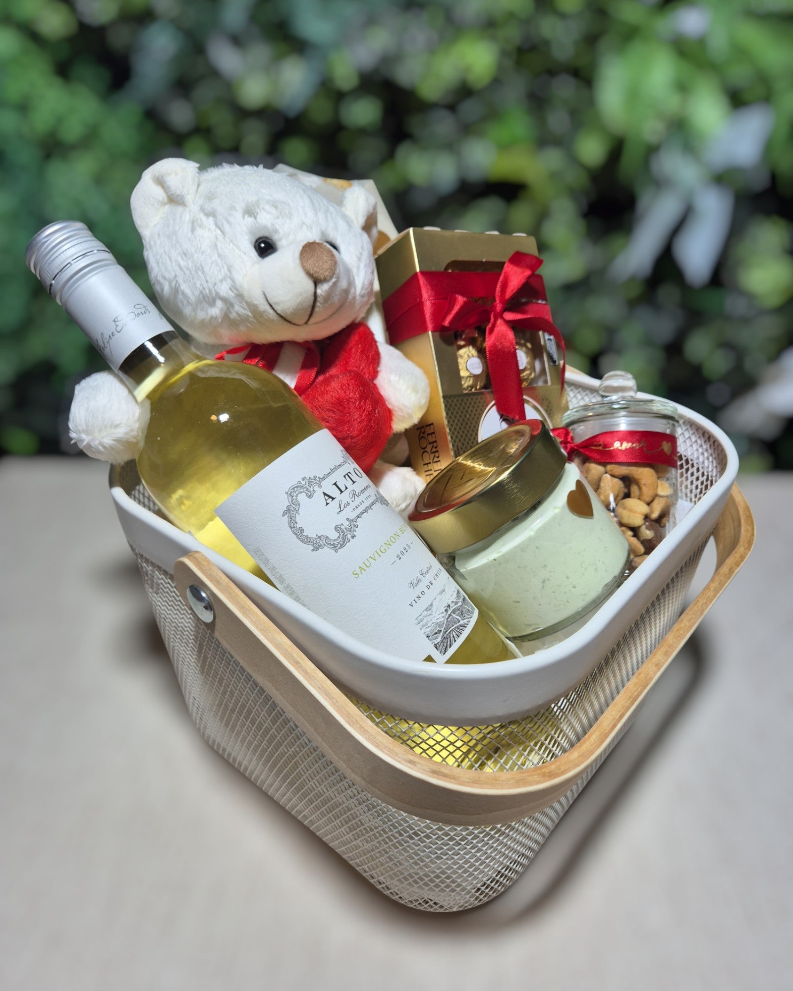 Eleve suas celebrações com nossa caixa exclusivo Cesto Aramado com Alça de Madeira contendo um Vinho refrescante e delicioso (Checar disponibilidade de rótulos), uma caixa de Ferrero Rocher com 8 unidades, um Pote de Vidro com Castanhas, um Pote de Vidro com Pastinha salgada e um maravilhoso pão Ciabata.