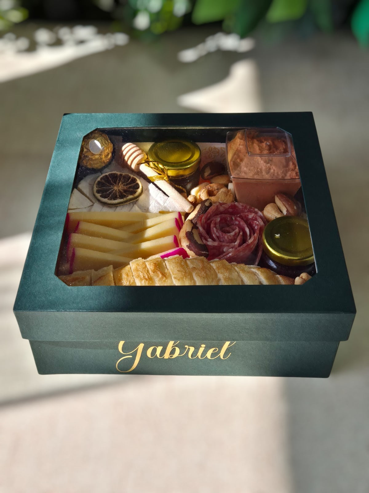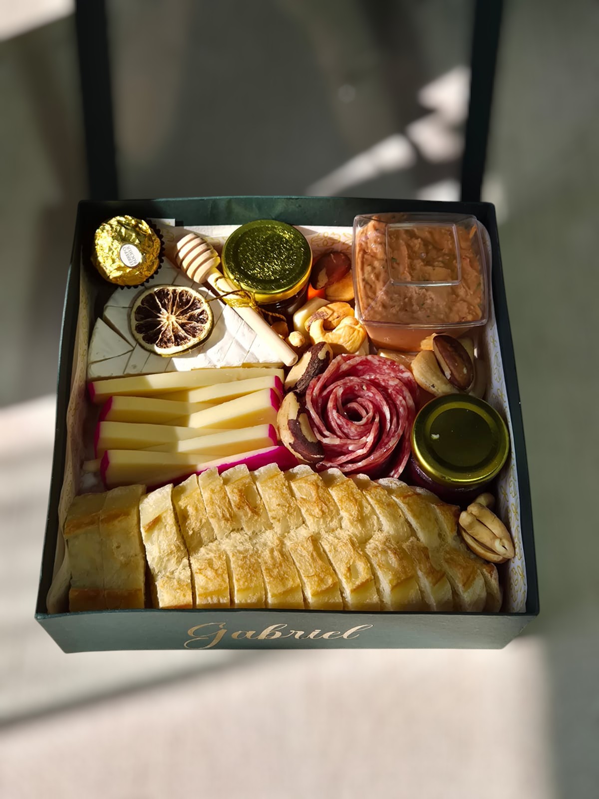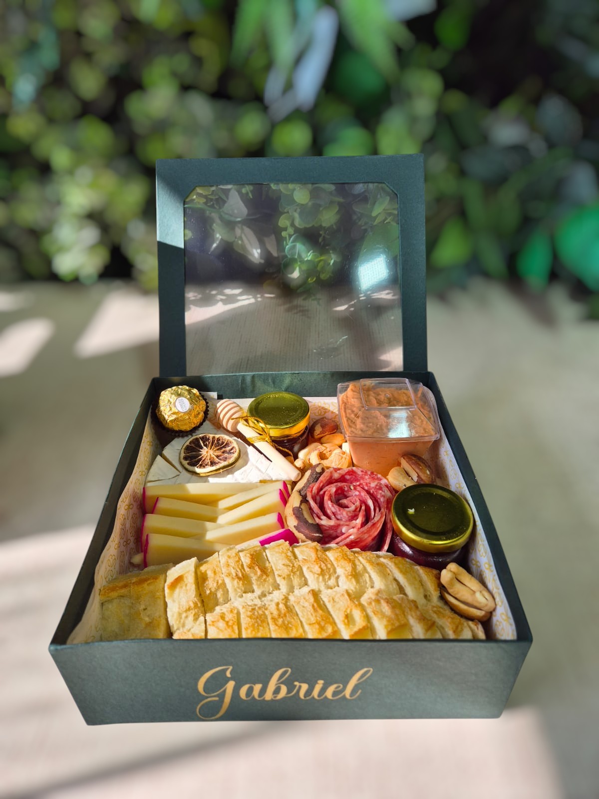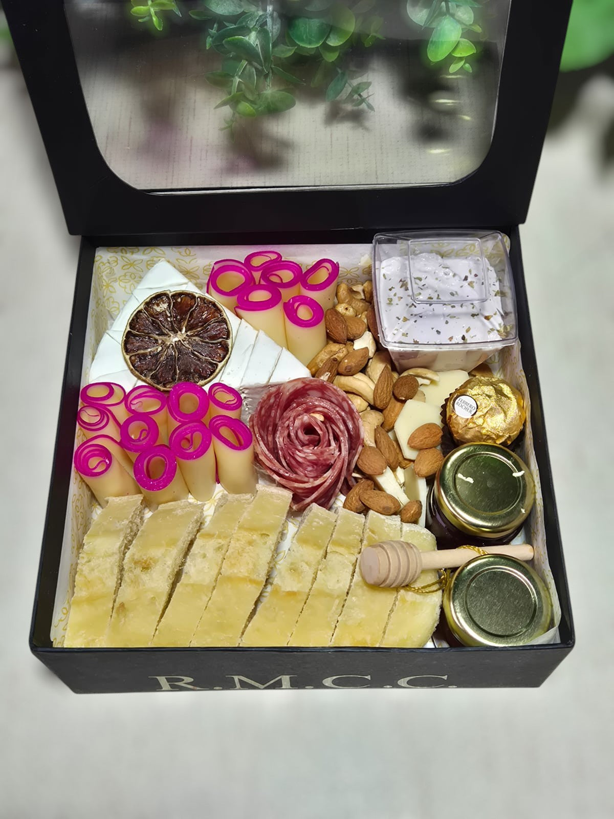 Queijos: Brie, Gouda e Provolone, Flor de Salame, geleia importada, mel no pote de vidro, uma charmosa mini colher meleira de bambu e nuts.