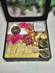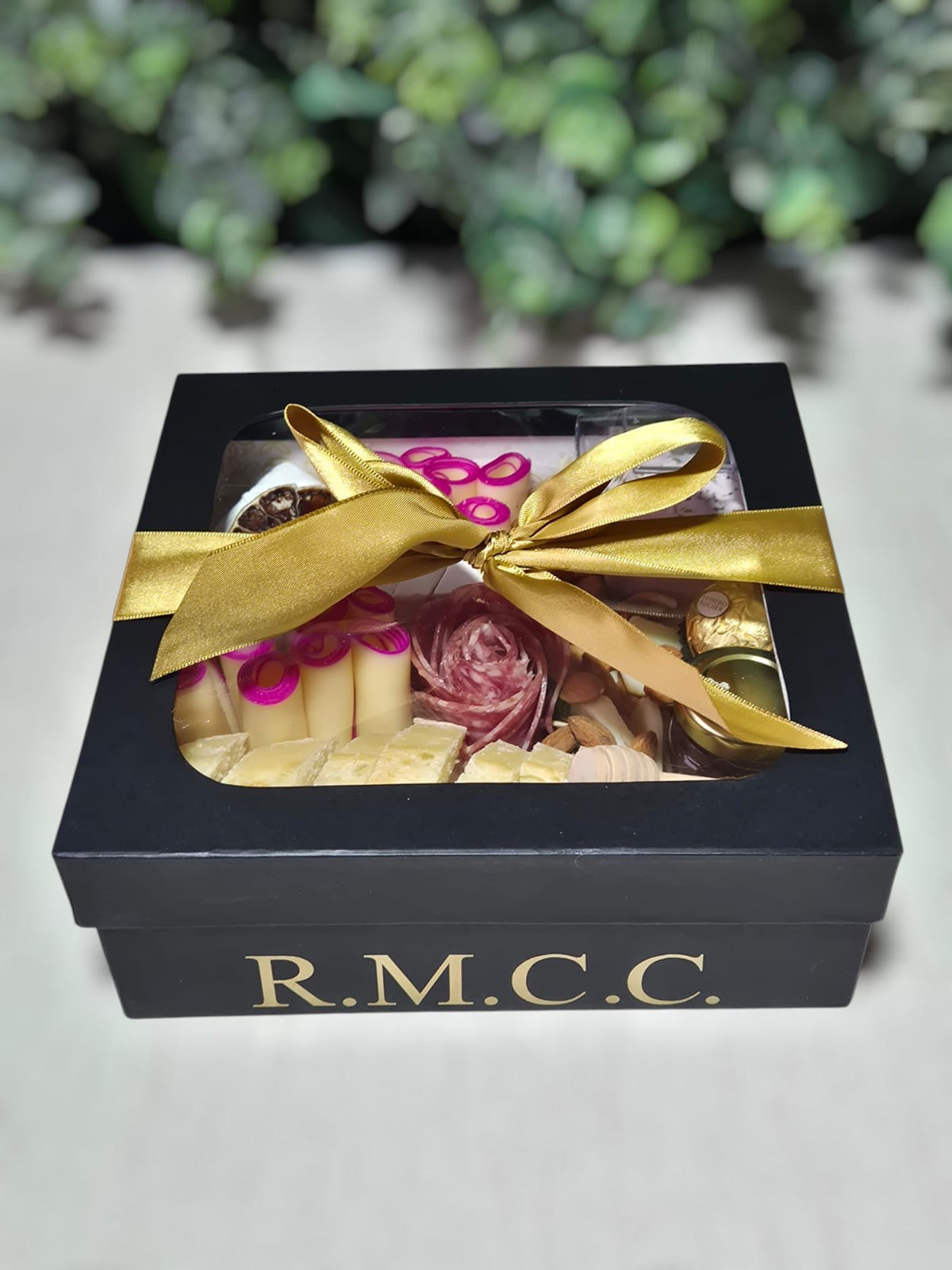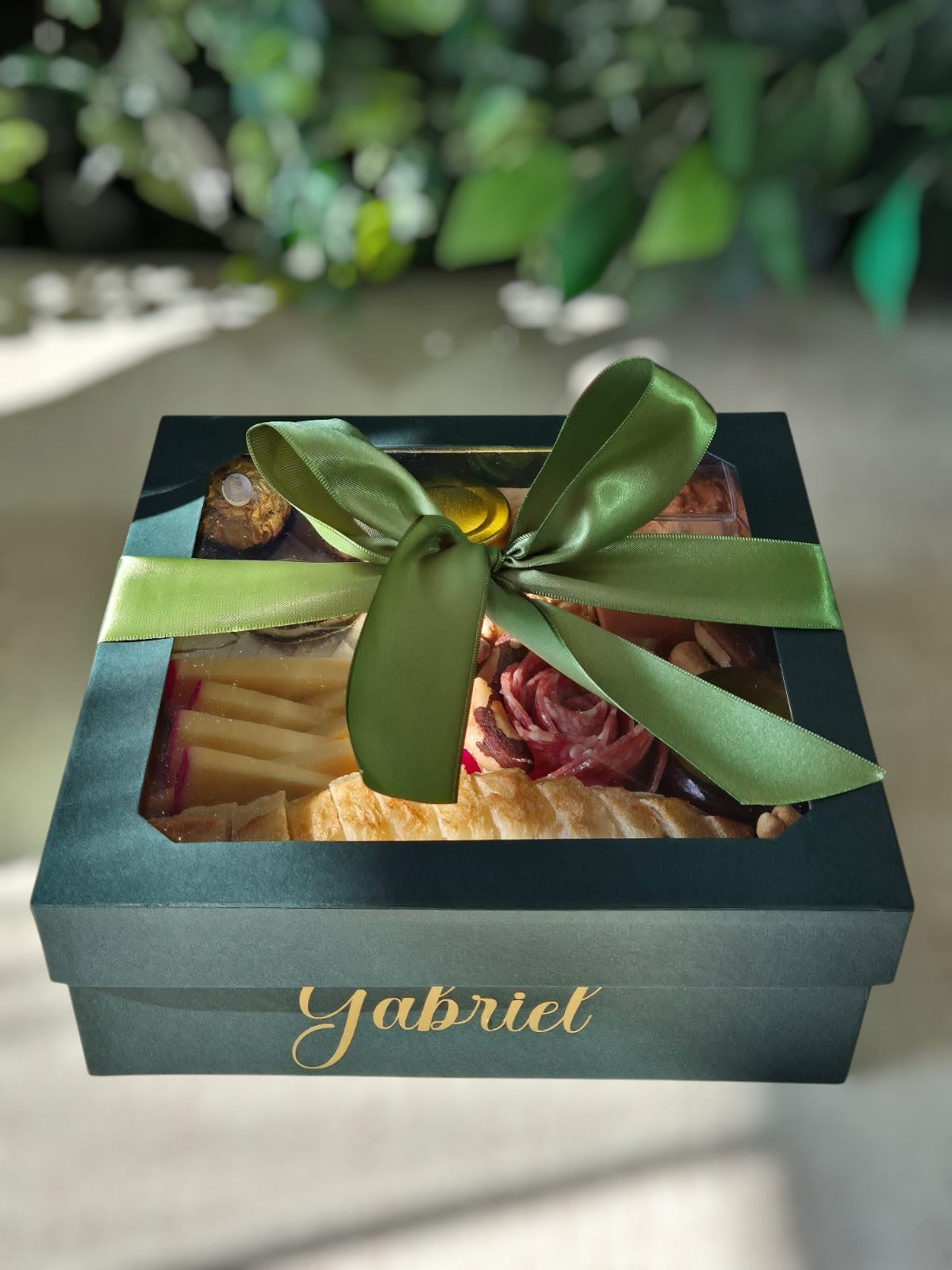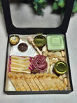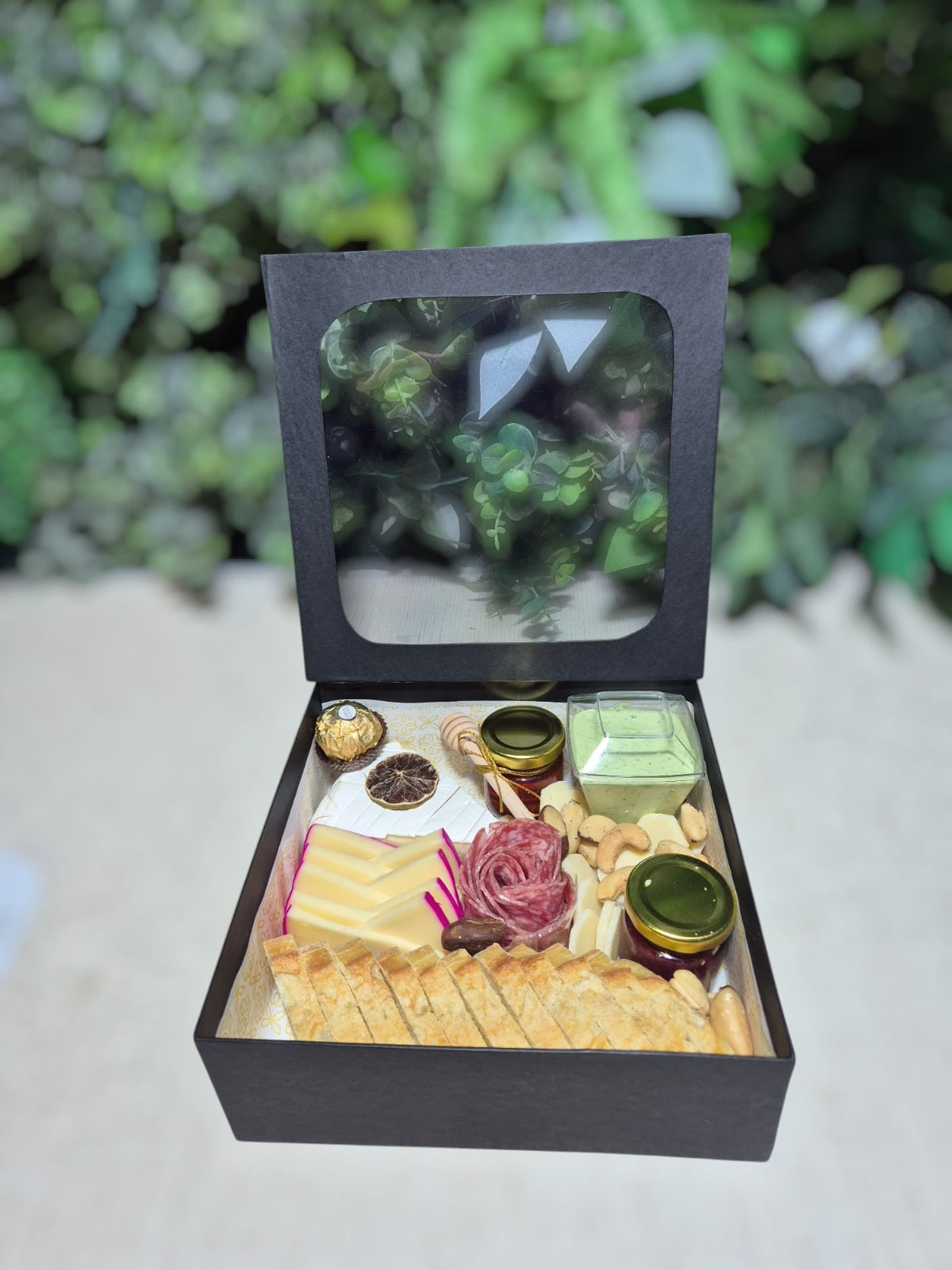 Queijos: Brie, Gouda e Provolone, Flor de Salame, geleia importada, mel no pote de vidro, uma charmosa mini colher meleira de bambu e nuts.