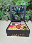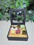 Uma linda caixa cartonada 20x20 com visor transparente em acetato, contendo: