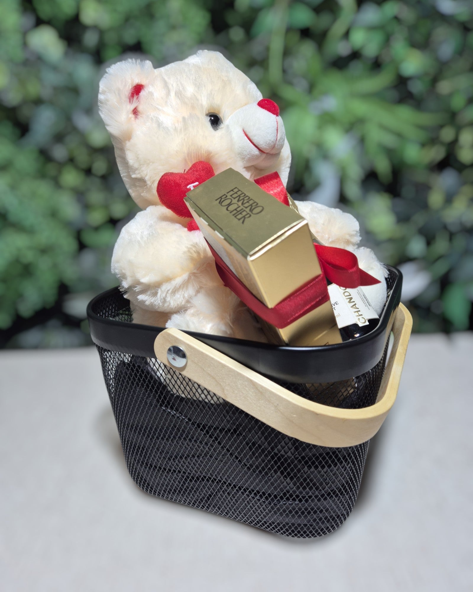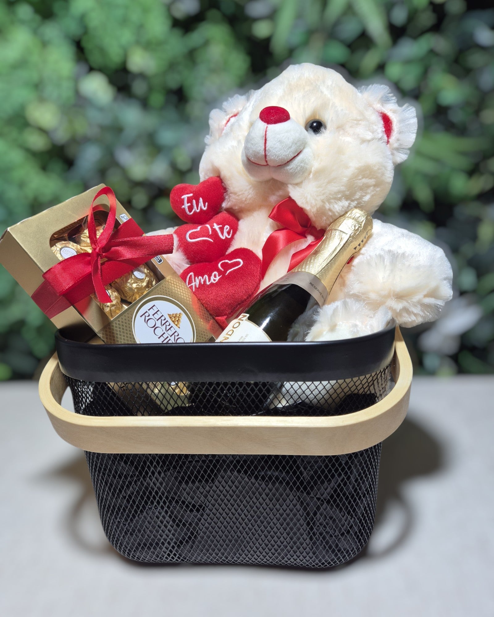 Eleve suas celebrações com nossa exclusivo Cesto Aramado com Alça em Madeira contendo um Lindo e Fofinho Urso de Pelúcia de aproximadamente 35cm, uma garrada de Baby Chandon de 187ml e uma caixa de Ferrero Rocher com 8 unidades
