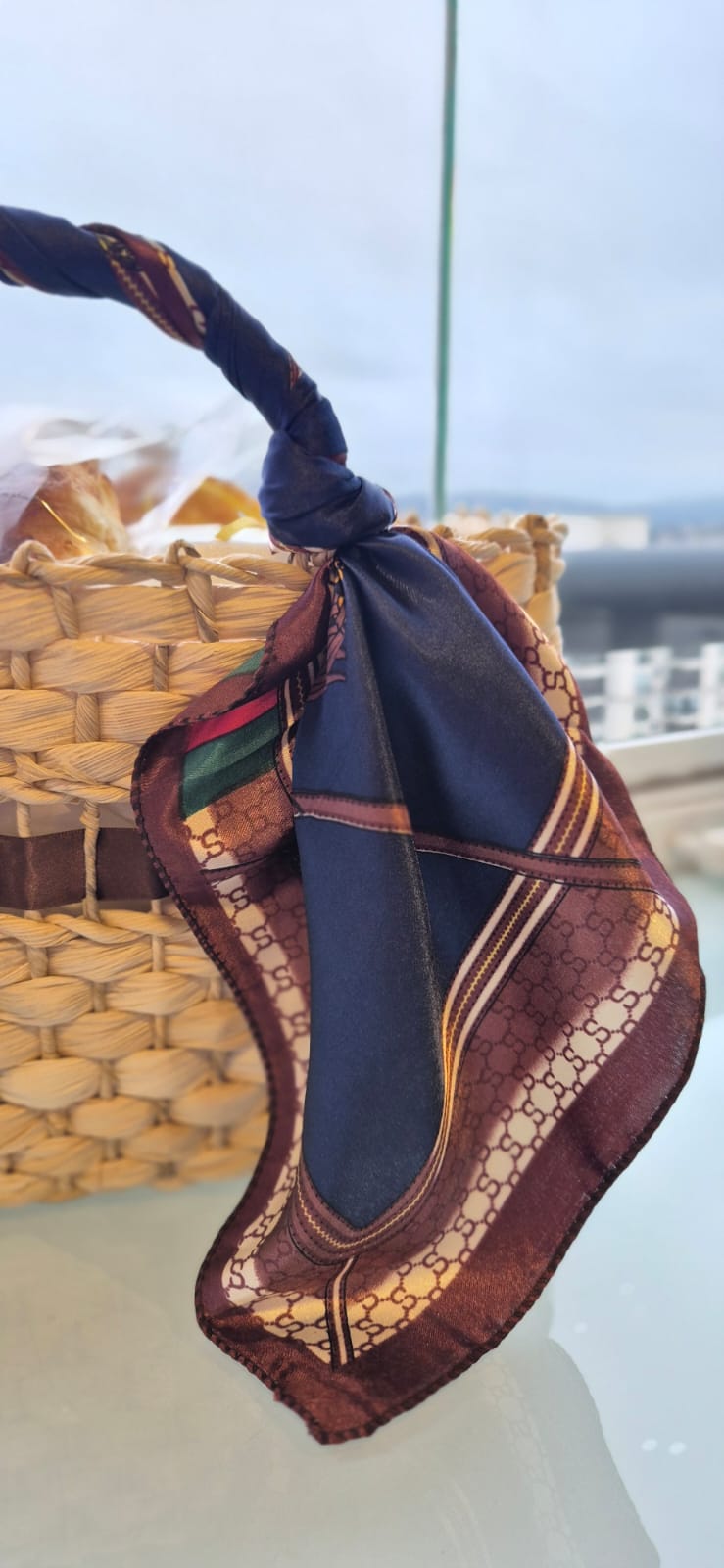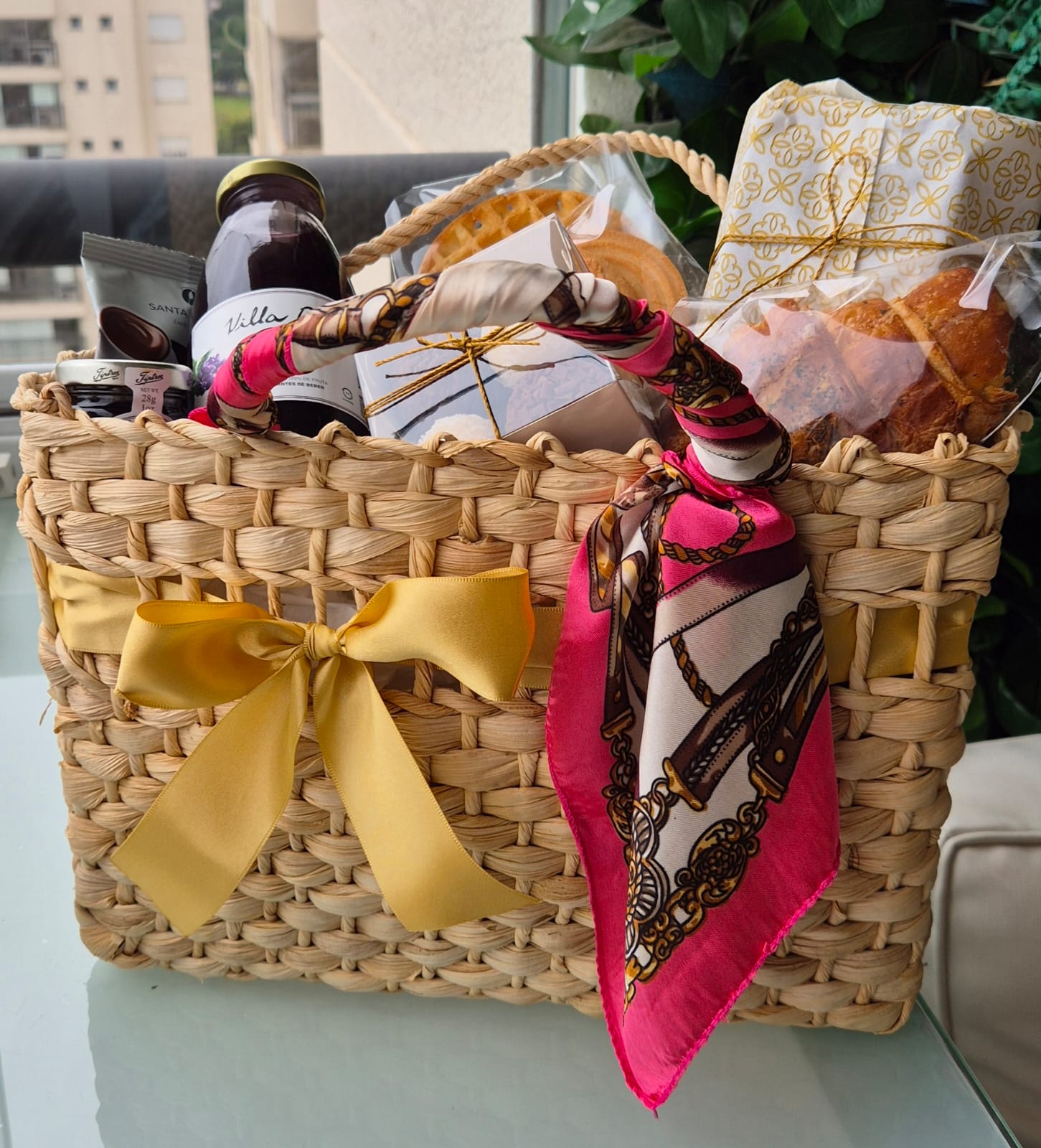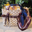Para um começo de dia luxuoso, a Bolsa de Palha Elegance é a escolha perfeita. Adornada com um lenço de cetim na alça, vem recheada com delícias para um café especial.