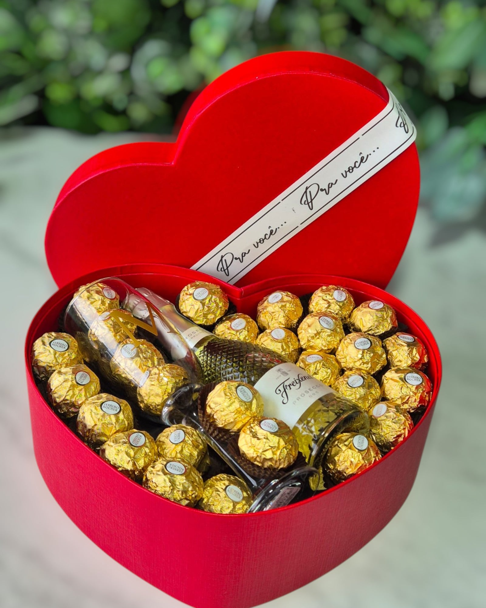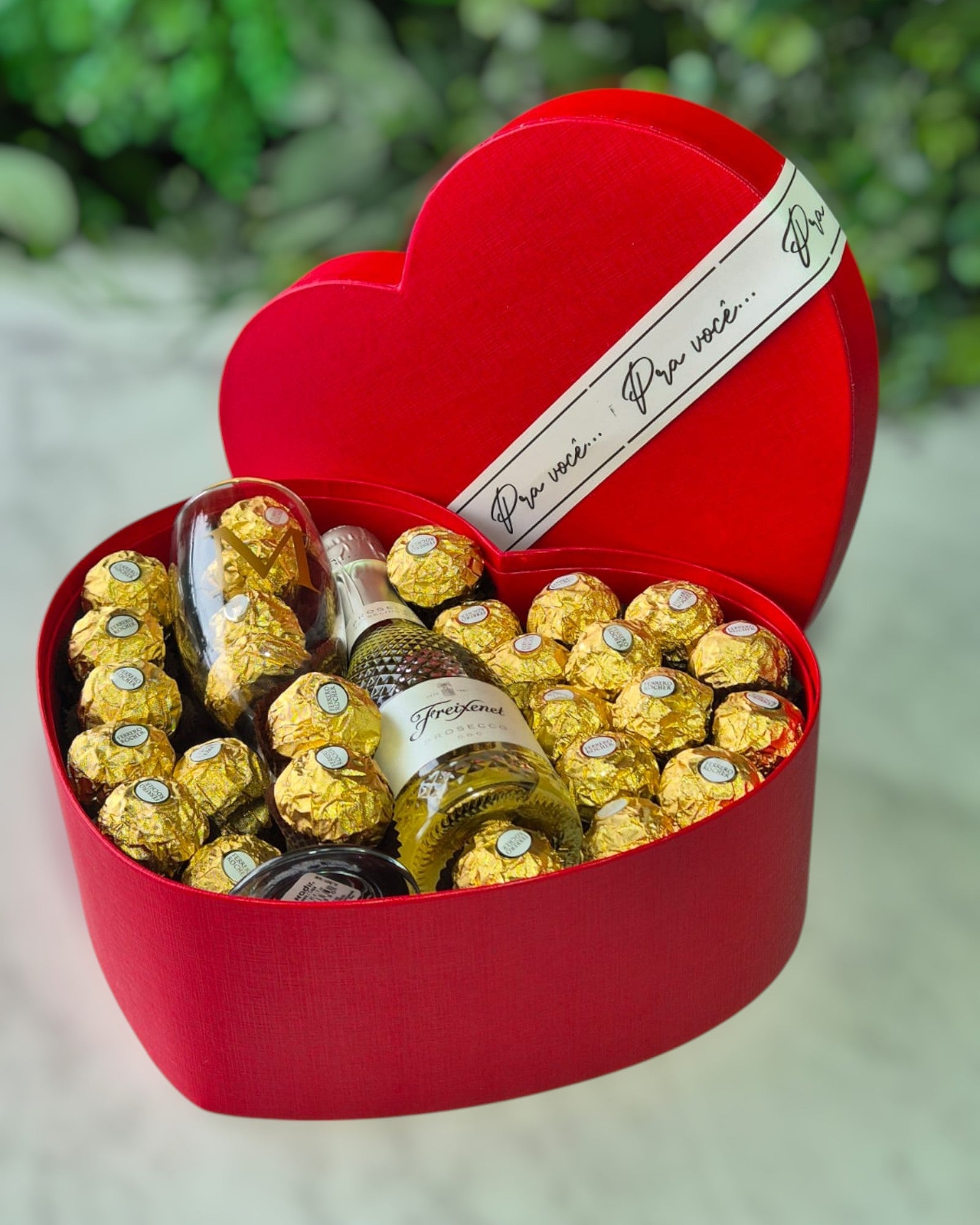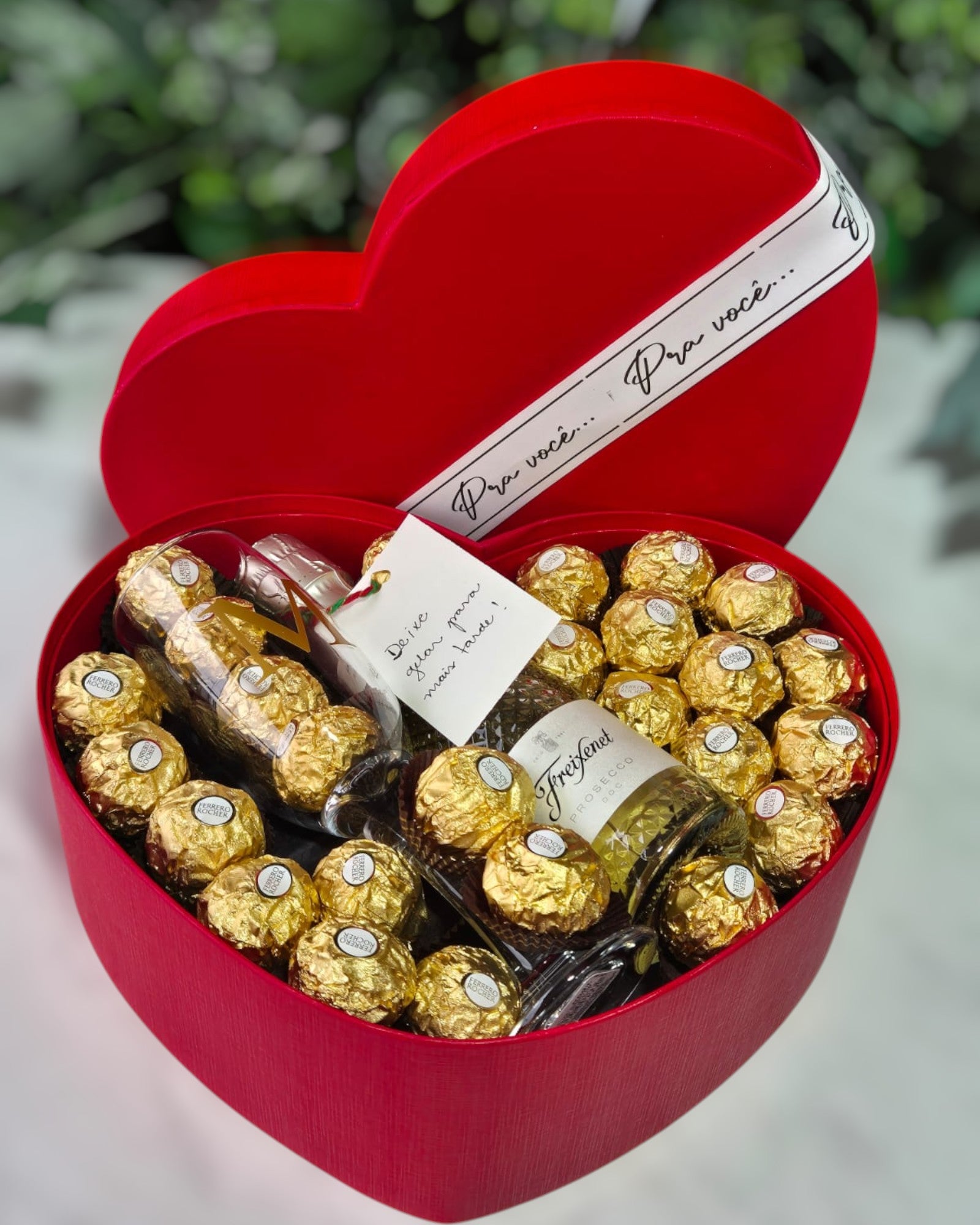 Numa maravilhosa caixa cartonada em forma de Coração, temos 27 unidades de Ferrero Rocher, uma taça com a letra da inicial do nome da pessoa amada e 1 garrafa de Baby Chandon ou Baby Freixenet (checar disponibilidade).