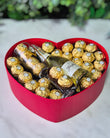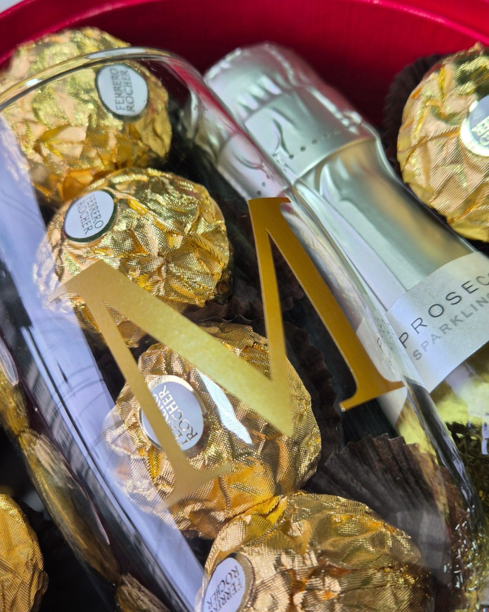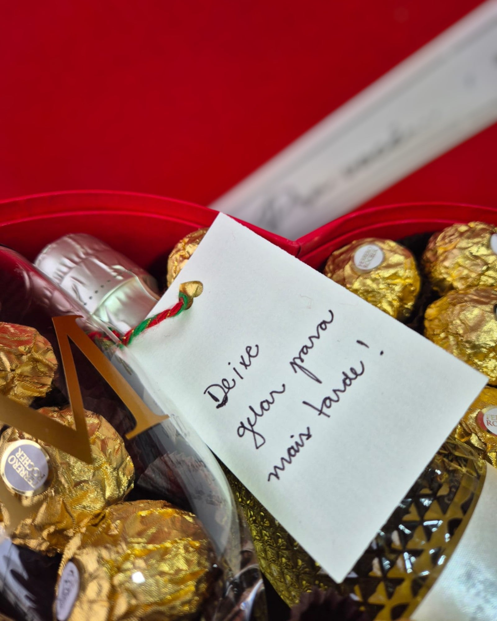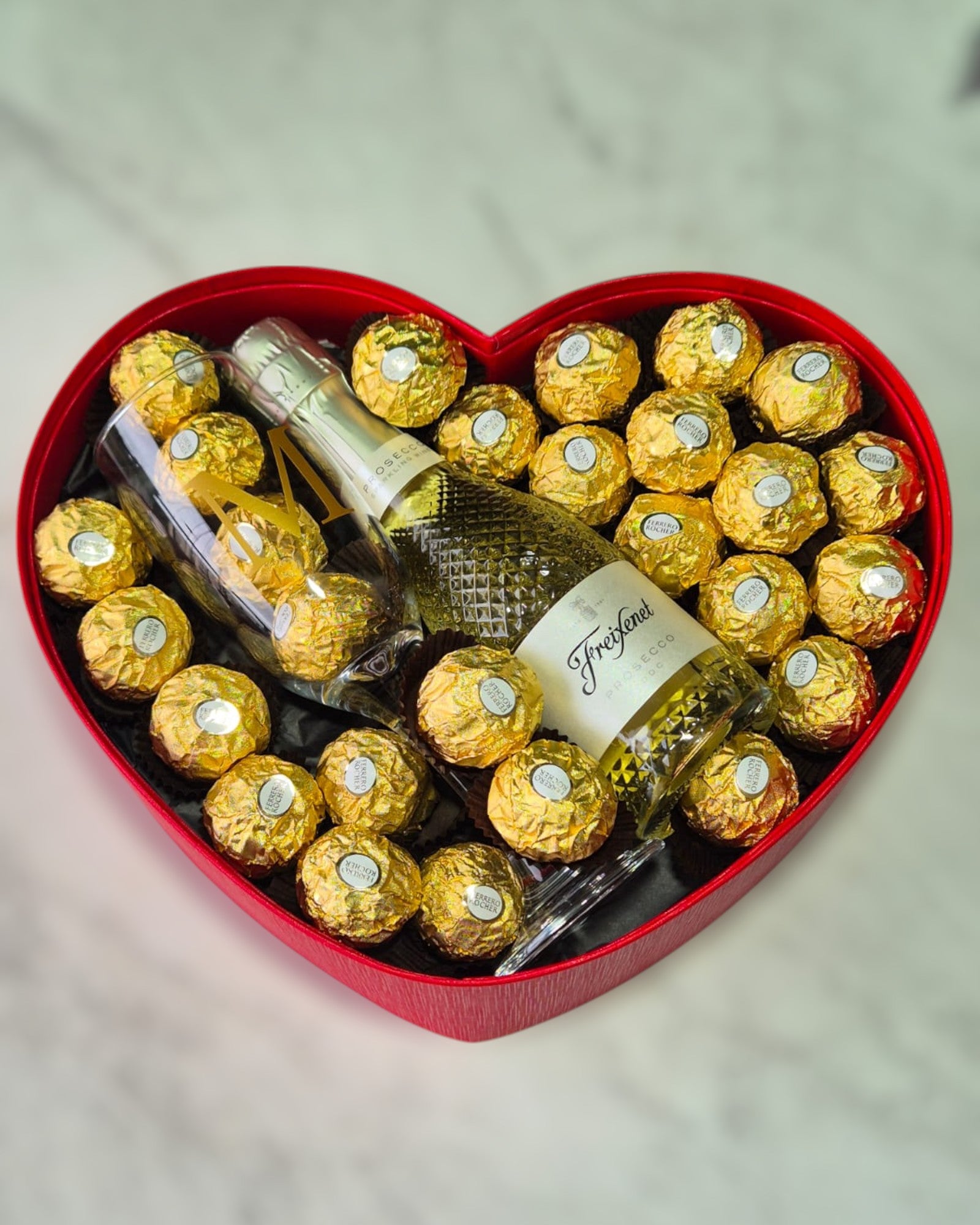 Numa maravilhosa caixa cartonada em forma de Coração, temos 27 unidades de Ferrero Rocher, uma taça com a letra da inicial do nome da pessoa amada e 1 garrafa de Baby Chandon ou Baby Freixenet (checar disponibilidade).