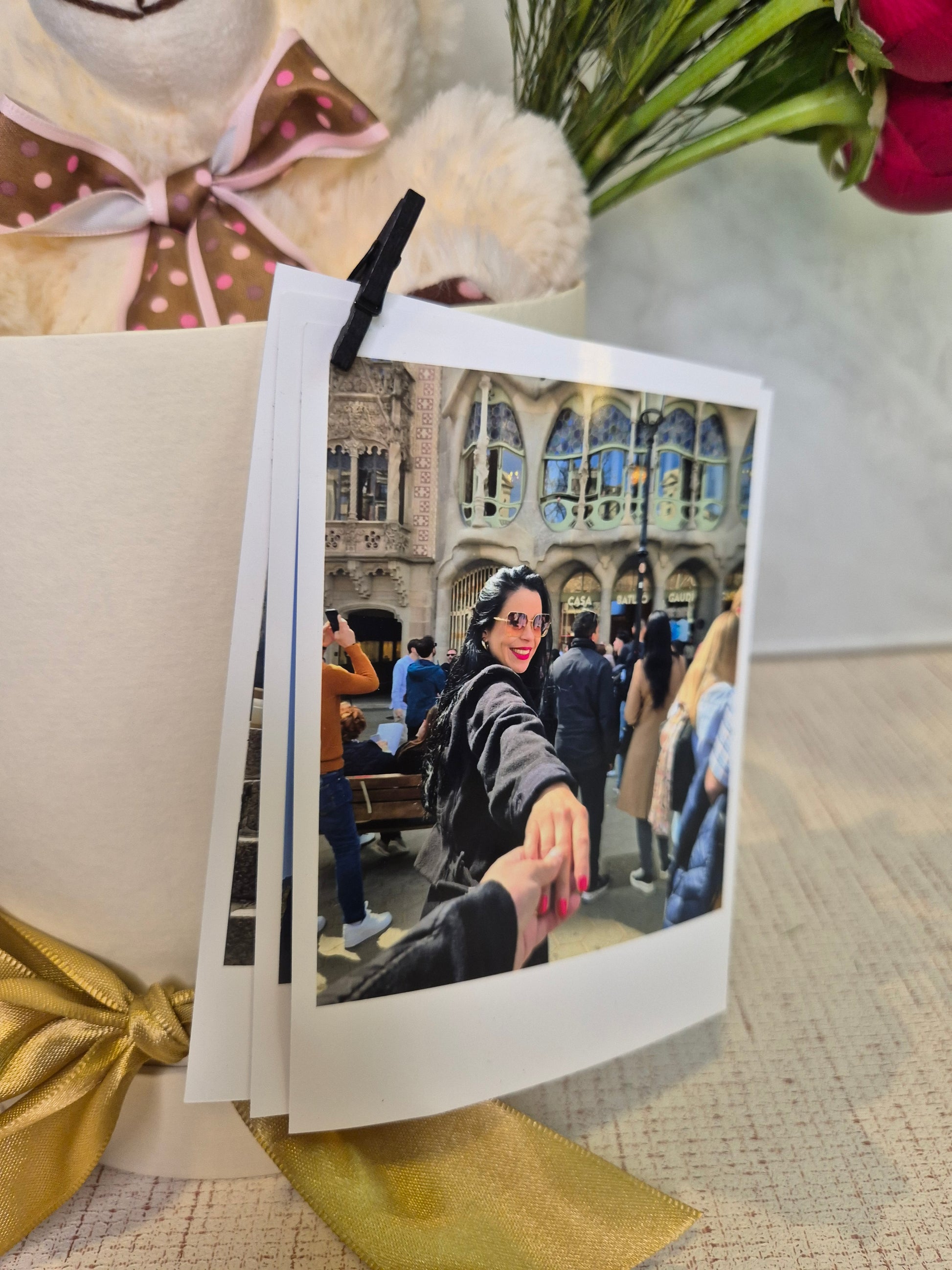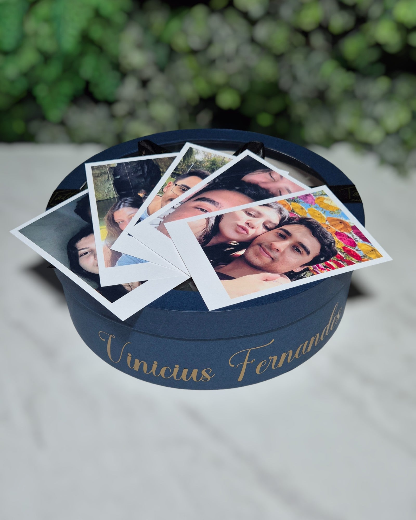 Nos envie as fotos por e-mail ou whatsapp, nos revelaremos no formato de câmera Polaroid e entregaremos juntos com sua cesta, aumentando ainda mais a linda surpresa para a pessoa presenteada.