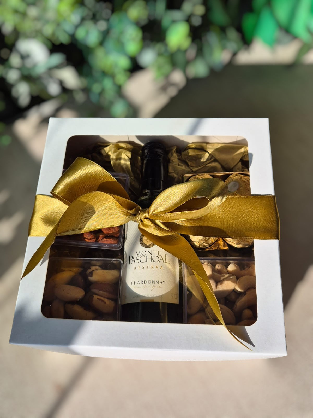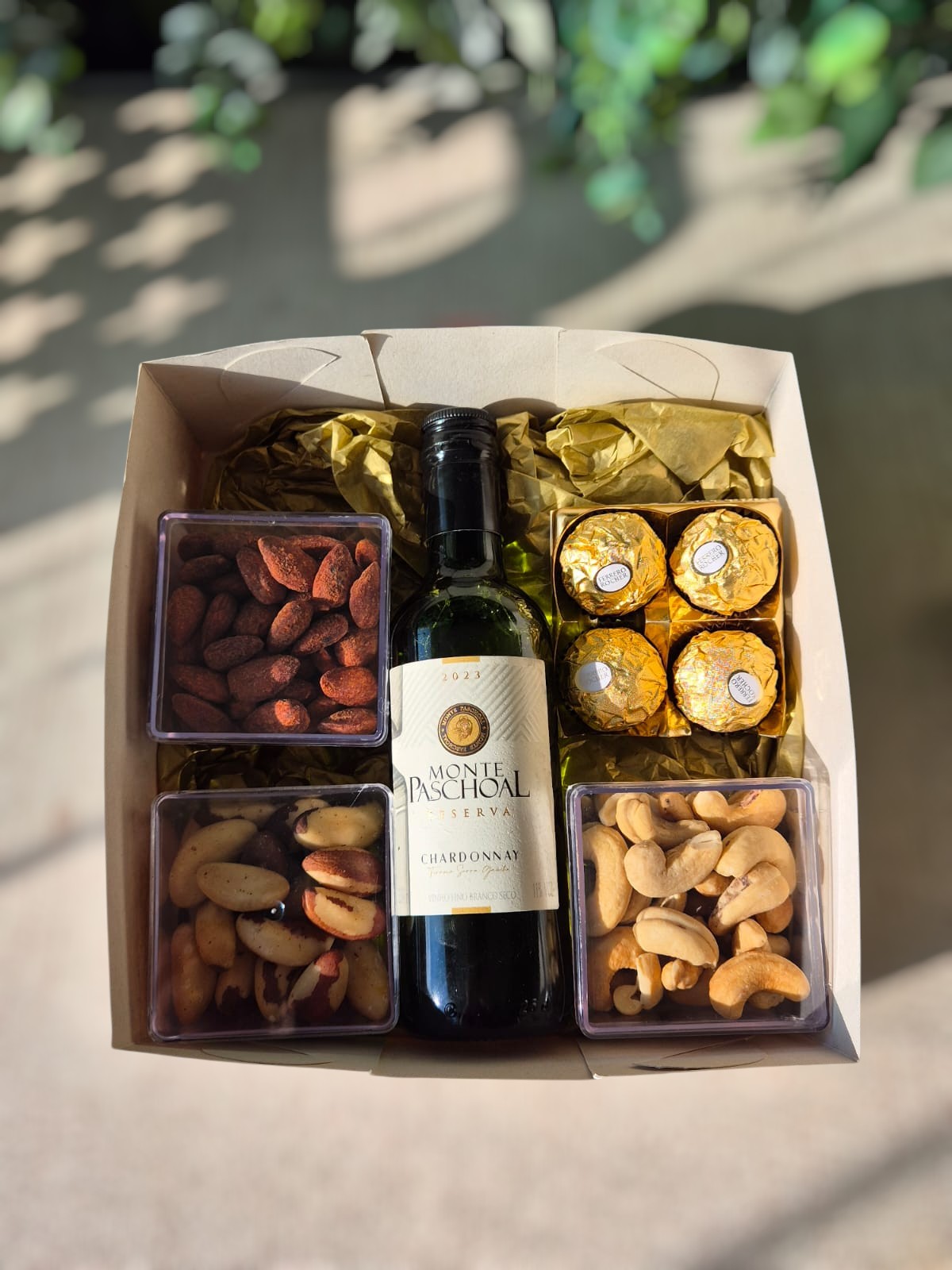 Caixa papelão branca de 20x20 cm contendo 1 mini garrafa de vinho (checar disponibilidade de rótulos), 4 deliciosos bombons Ferrero Rocher, 1 caixa de acrílico com Castanhas de cajú, 1 caixa de acrílico com castanhas do Pará e 1 caixa de acrílico com Amêndoas Defumadas. Cada uma com aproximadamente 100g.
