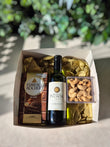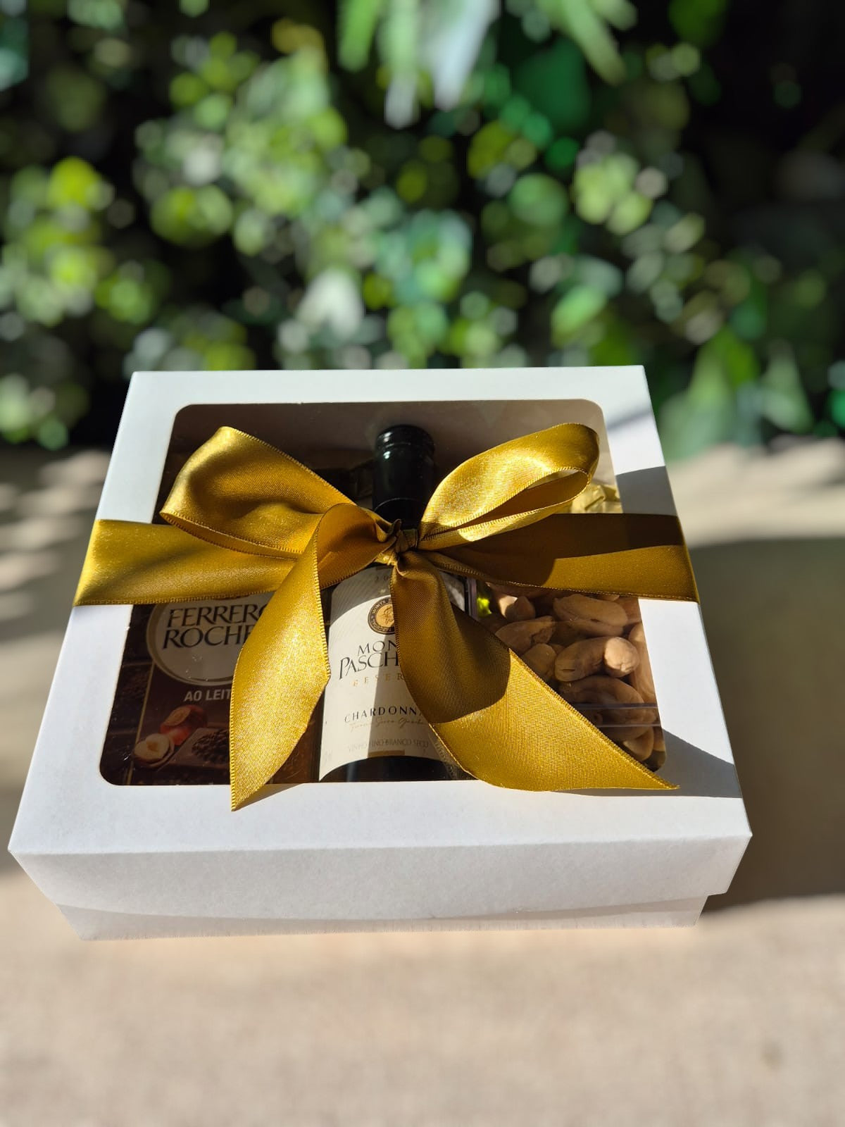 Caixa papelão branca de 20x20 cm com tampa com visor, contendo 1 mini garrafa de vinho de 250ml (checar disponibilidade de rótulos), 1 barra de chocolate Ferrero Rocher de 90g e 1 caixa de acrílico com castanhas de cajú (aproximadamente 50g)