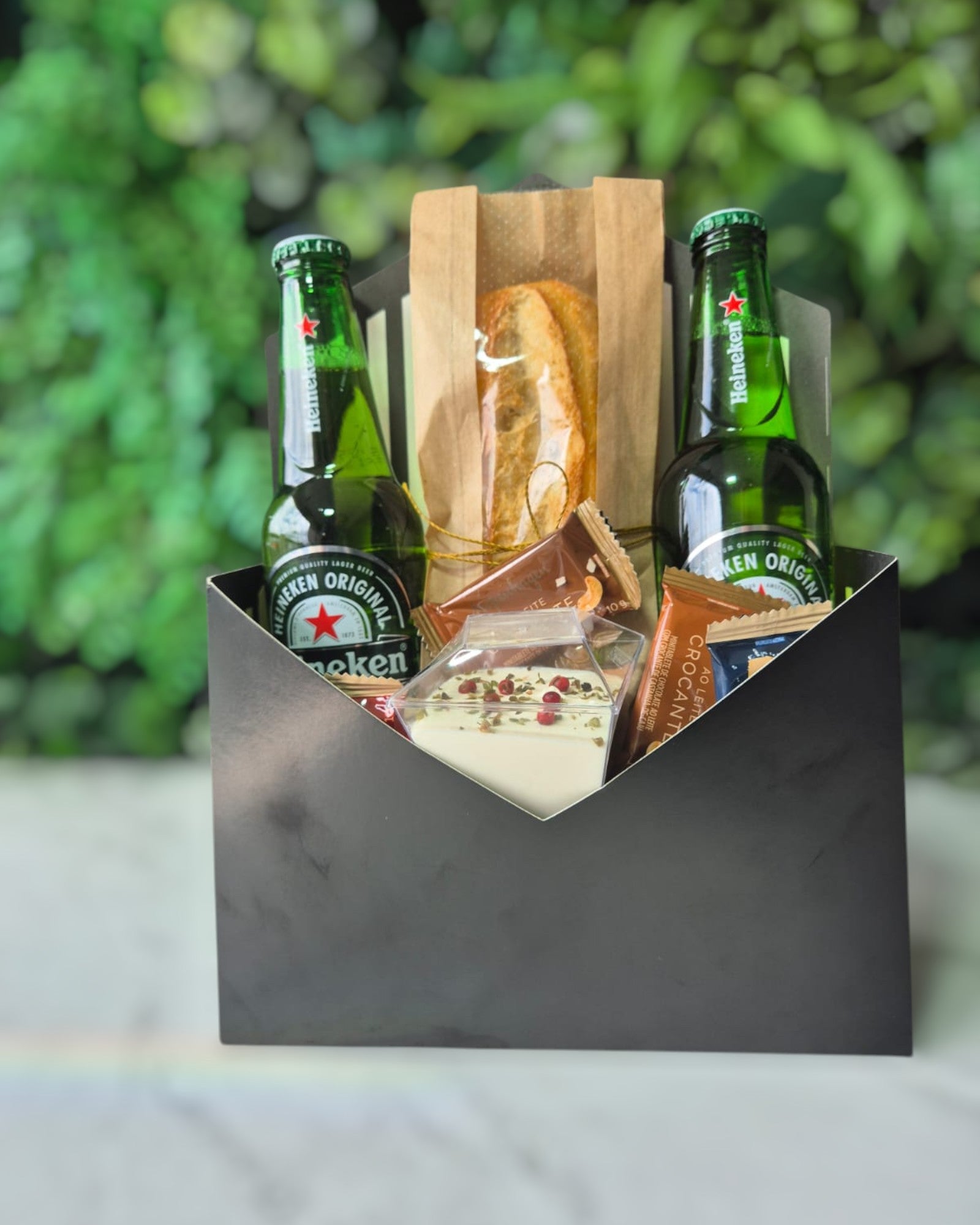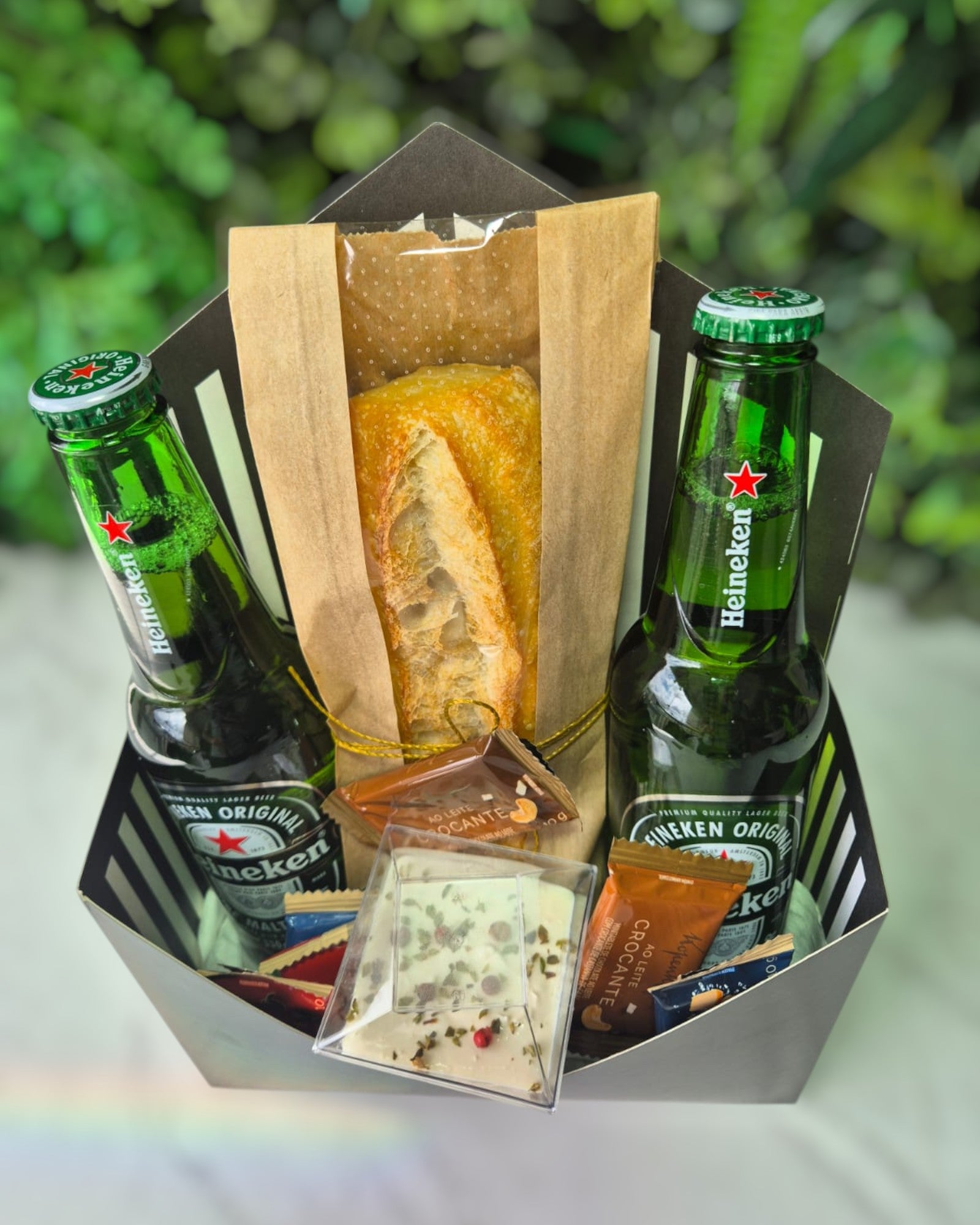 É perfeito para um final de semana tranquilo, acompanha 2 cervejas Heinecken 300ml, pão ciabata fresco e deliciosamente perfeito para ser consumido com uma deliciosa pastinha salgada e para finalizar acompanha mini tabletes de chocolates finos sabores variados.